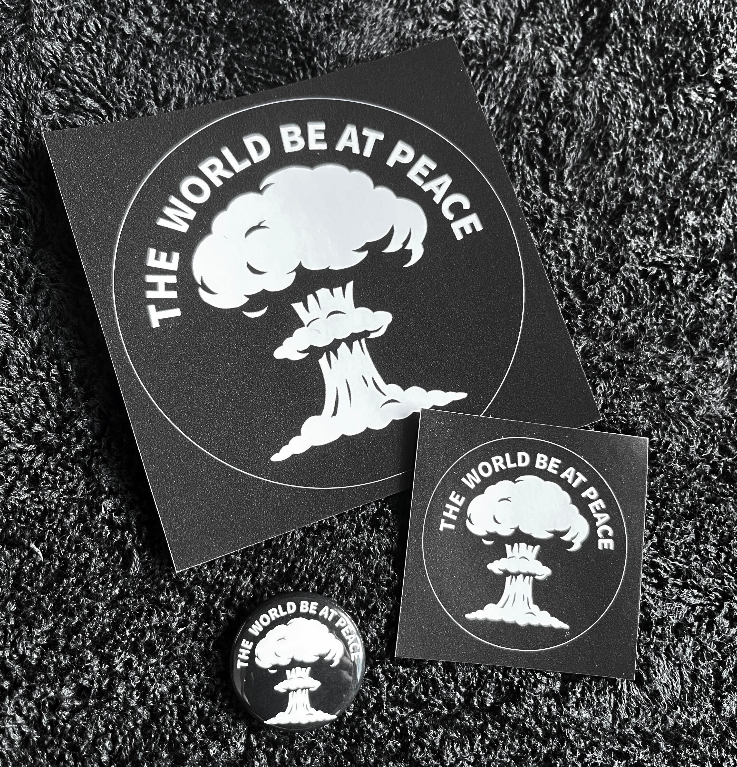 This set features a bold “fatal iPhone fingertip drawing” of a nuclear cloud, along with a message wishing for world peace, available as stickers and a pin badge.